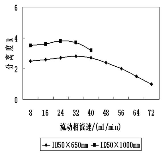 為考察柱長(zhǎng)對(duì)制備分離效果的影響,本文采用ID 50 mm×650 mm、ID 50 mm×1 000 mm這2種不同柱長(zhǎng)的柱子,對(duì)高壓制備液相色譜分離過(guò)程進(jìn)行了研究。圖5給出了不同柱長(zhǎng)下流動(dòng)相流速對(duì)柱效的影響,結(jié)果表明,當(dāng)其他條件相同時(shí),柱效隨柱長(zhǎng)的增大而降低;圖6是不同柱長(zhǎng)下流動(dòng)相流速對(duì)分離度的影響,結(jié)果表明,當(dāng)其他條件相同時(shí),柱長(zhǎng)增大,可顯著提高分離度。